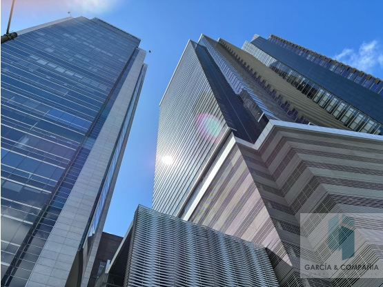 Con 93,8 m², cuenta con divisiones en vidrio, sala de juntas, oficina gerencial con baño privado, área de coworking para 12 puestos, zona de archivo, cocina y dos parqueaderos propios. Además, el piso ofrece baños de lujo para hombres y mujeres y ascensor de carga.